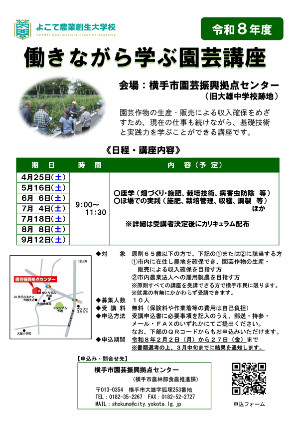 園芸作物の生産・販売による収入確保をめざすため、現在の仕事も続けながら、基礎技術と実践力を学べる講座を開催します。事前申込が必要となりますので、詳細はチラシまたは横手市HPをご確認ください。