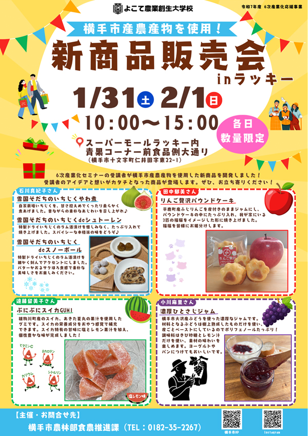 横手市産農産物を使用したオリジナル商品の販売会を開催します。商品は6次産業化セミナーの受講者が開発しました。受講者のアイデアと想いがカタチとなった商品が登場します。ぜひお立ち寄りください!