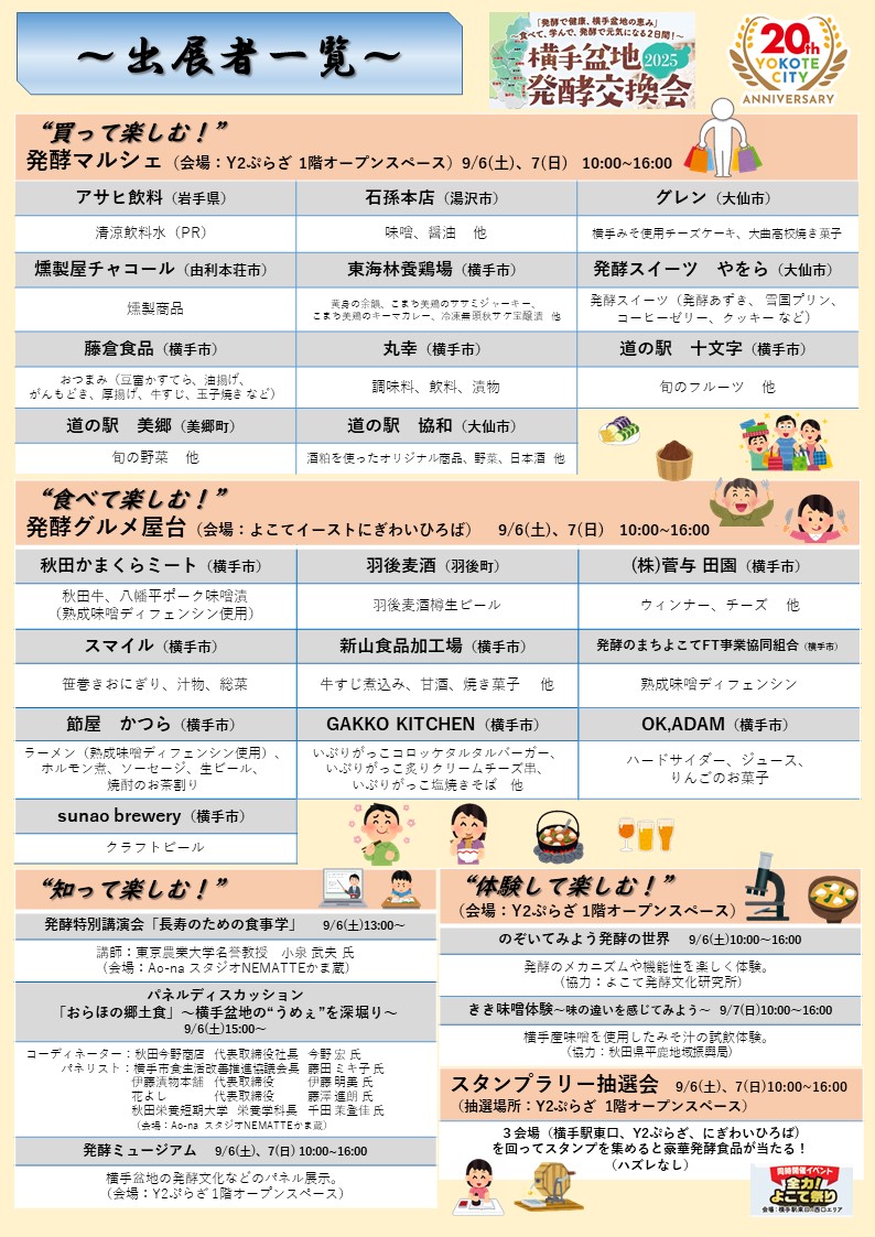内容:横手盆地内の発酵食品事業者による物産展。「スイーツ」や「おつまみ」が盛りだくさん!